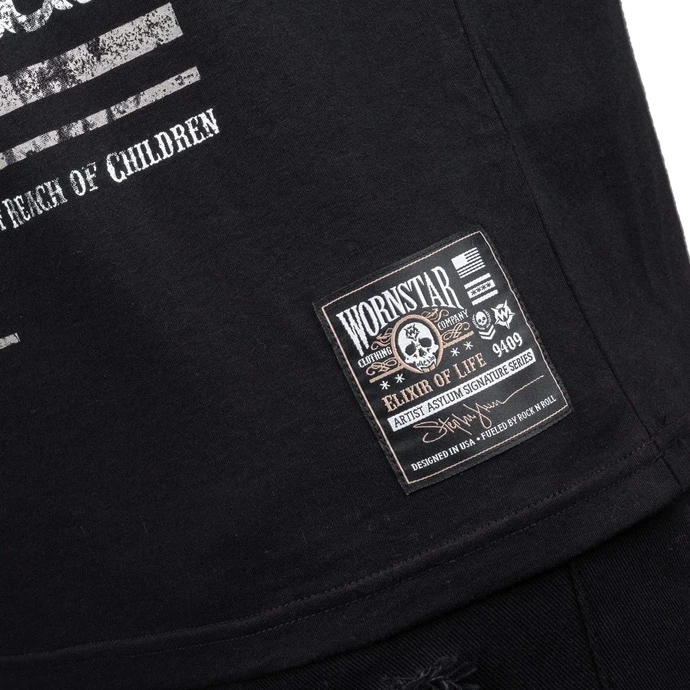 Men’s stylish t-shirt with a quality print. Designed in U.S.A. Composition: 100% cotton. Brand: WORNSTAR. Color: black Wash inside out, in a gentle program at low temperatures. Approximate dimensions in cm (CIRC. is 2x width)