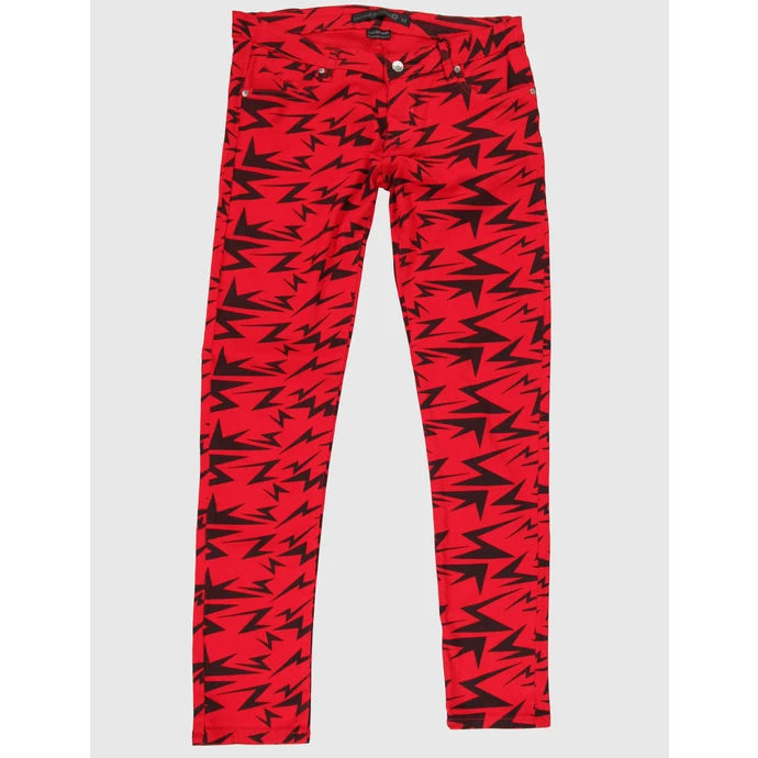 narrow and slightly elastic women’s pants brand CRIMINAL DAMAGE. Color: red, black. Composition: 98% cotton, 2% elastane. Facilities: two front and two rear pockets, slit opening with button and zipper, printing. Approximate dimensions in cm approx .: