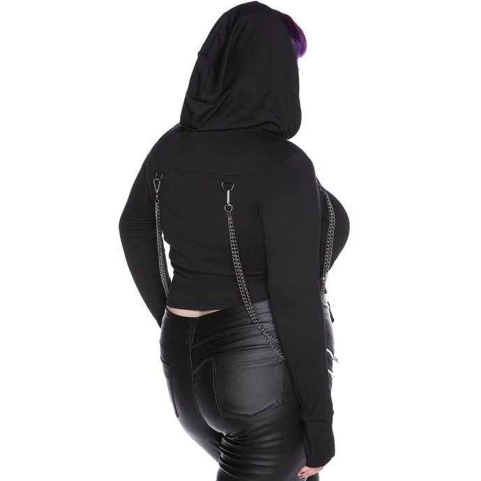 The hoodie has a large hood without drawstring, the collar is raised, zipper closure, the package also includes two metal chains with the possibility of detachment.